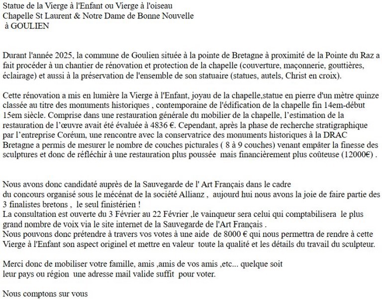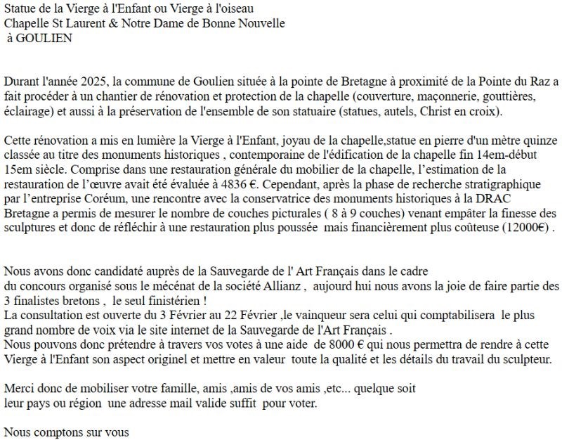 L´association de ND de Langoas a été crée le 28 Mars 1981. Son objectif est d´apporter son concours à l´entretien, la restauration et l´aménagement de la Chapelle de Notre Dame de Langroas. Elle ne poursuit aucun but lucratif.